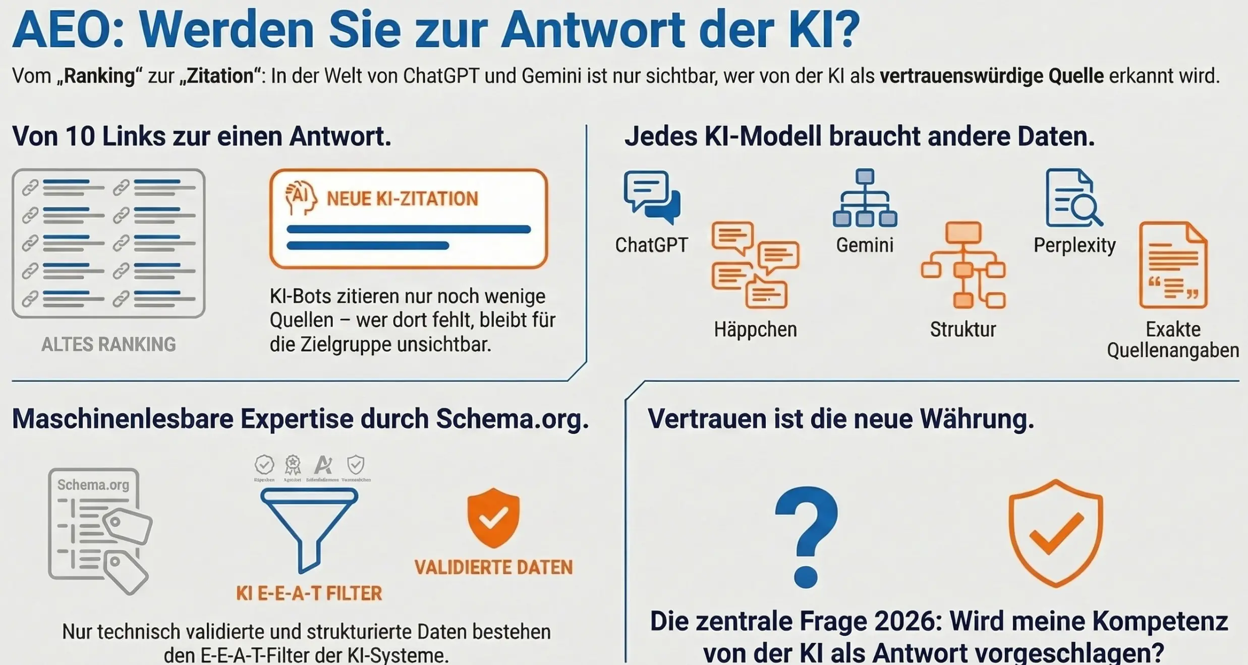 2026 lautet die Frage nicht mehr «Wie ranke ich?», sondern «Werde ich von der KI als Antwort vorgeschlagen?». Die Lösung ist technische Validität: Nur verifizierbare Daten führen zu Zitationen.